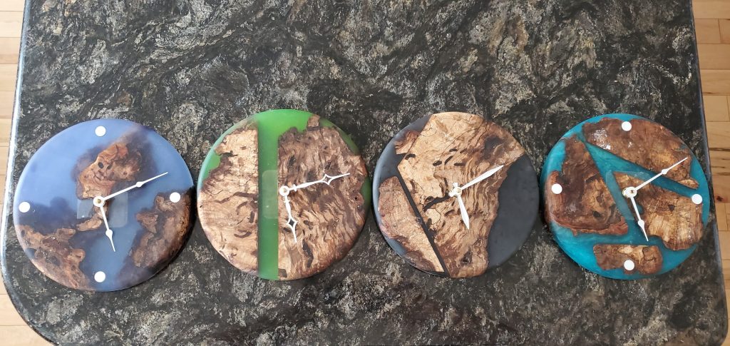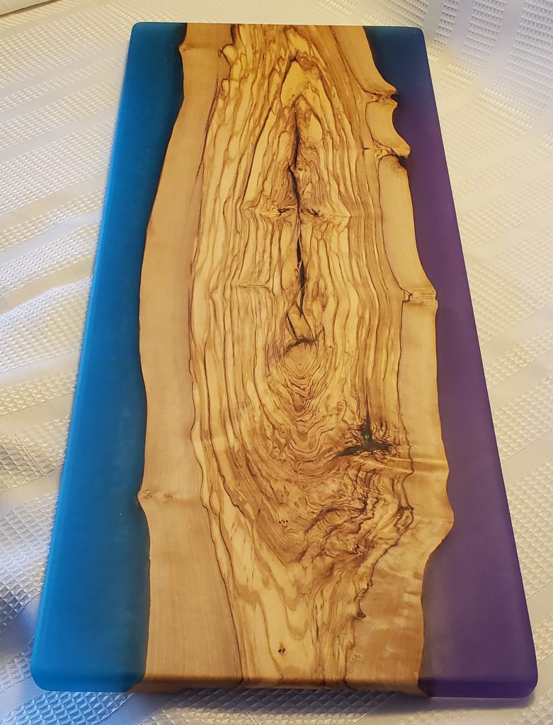 Olive wood with purple and blue epoxy. 23″ X 9-12″
