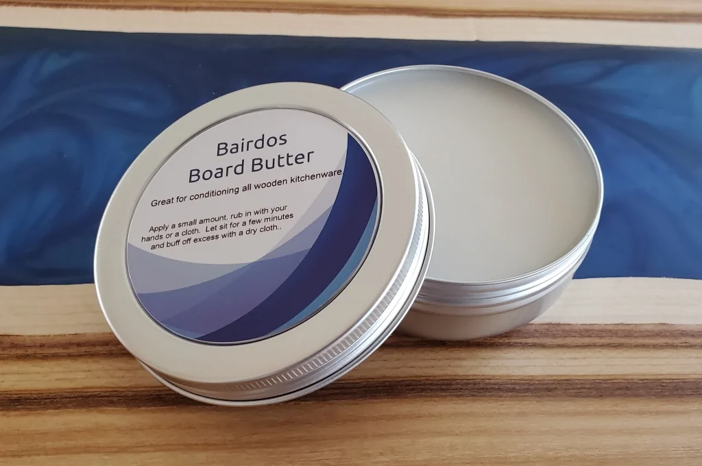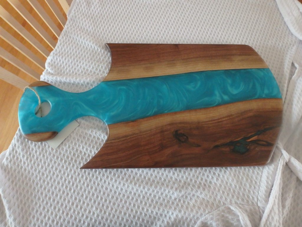 Black walnut and blue epoxy. 23-1/4″ X 11-1/2″ X 5-8″ thick