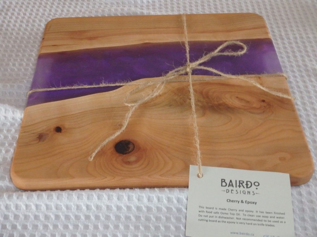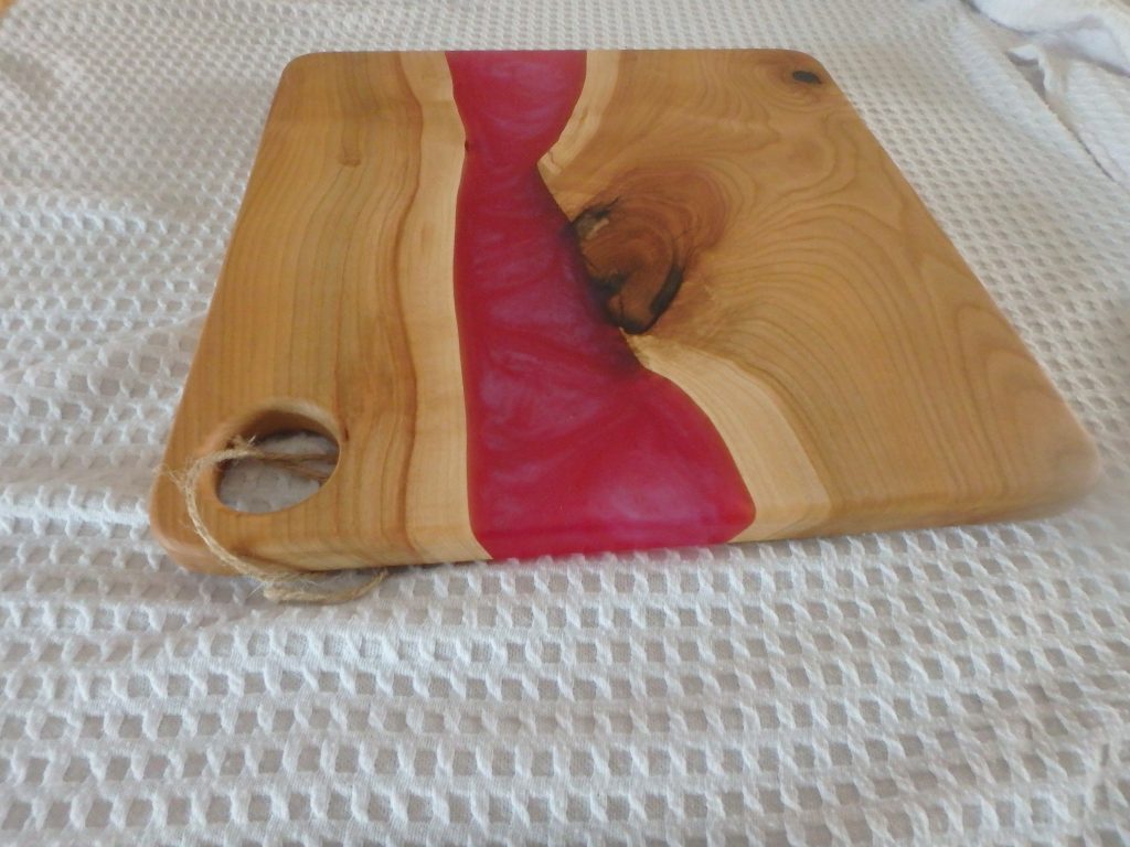 Cherry and purple epoxy. 11-1/2″ X 12″ x 3/4″ thick.