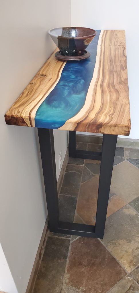 Chokecherry wood with epoxy table 43-1/2” x 13” x 35-1/2” tall.